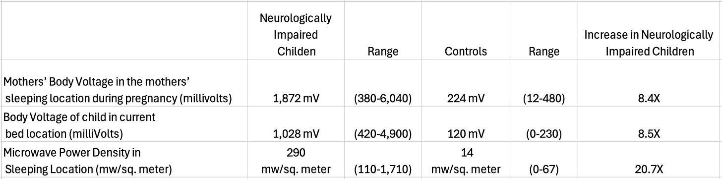 •Suspecting there might be a link between EMF exposure and neurological disorders, Dietrich Klinghart (a renowned integrative medicine physician) conducted a study where he compared the prenatal EMF exposures of 10 neurologically impaired children (8 of whom were autistic) with 5 controls. He found high prenatal EMF exposures dramatically increased the risk of neurological disabilities: