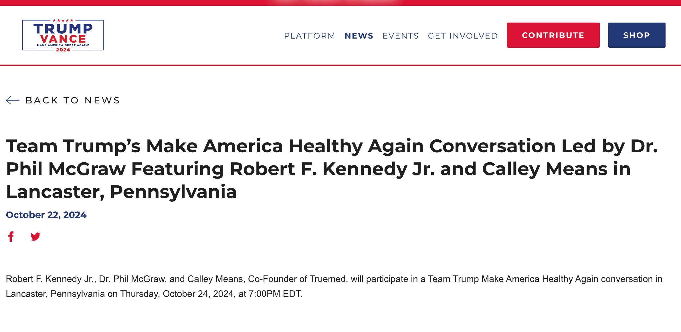 This growing revolt is, in part, prompted by the central role of Pharmaceutical Industry lobbyist Calley Means in the Trump HHS transition team process. Mr. Means’ relationship to President-elect Trump apparently preceded the recent election cycle, and to the best of my understanding it was Calley Means who brokered the “rapprochement” between then-Republican party candidate President Trump and independent candidate Robert F. Kennedy Jr.