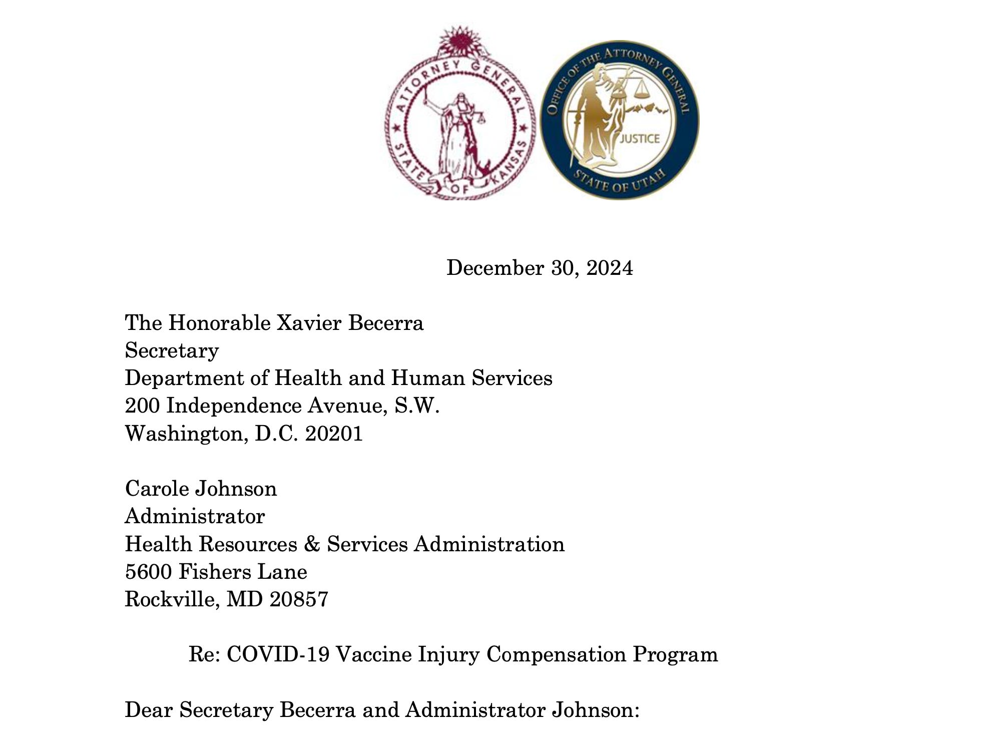We, the Attorneys General of Utah, Kansas, Arkansas, Idaho, Indiana, Louisiana, Mississippi, Montana, Nebraska, North Dakota, Oklahoma, South Carolina, South Dakota, and Texas, write to express our serious concerns with how individuals harmed by COVID-19 vaccines are being treated by the federal government. We seek answers to questions about the administration of the Countermeasures Injury Compensation Program (CICP).