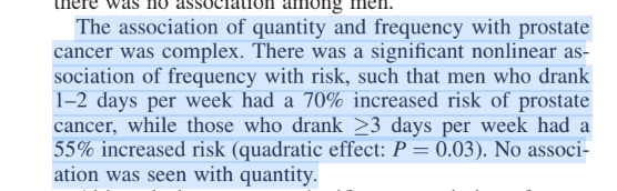 Now, the definition changes. This is by days per week not light, moderate and heavy. Why is that? Also are you saying that I lower my risk of prostate cancer by drinking more on Friday if I drank Weds and Thursday? A implausible conclusion.