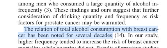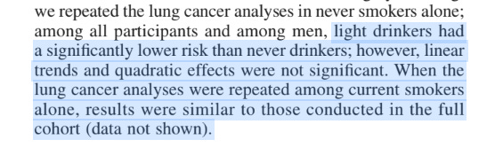 - The study is asking if alcohol use is linked to cancer mortality, but not whether changing one’s alcohol use reduces cancer. One can imagine a target trial observational analysis (ala Hernan) that tackles the salient causal question. Should I adjust my intake?