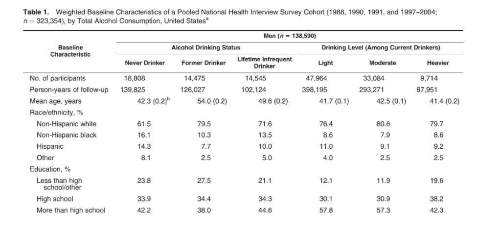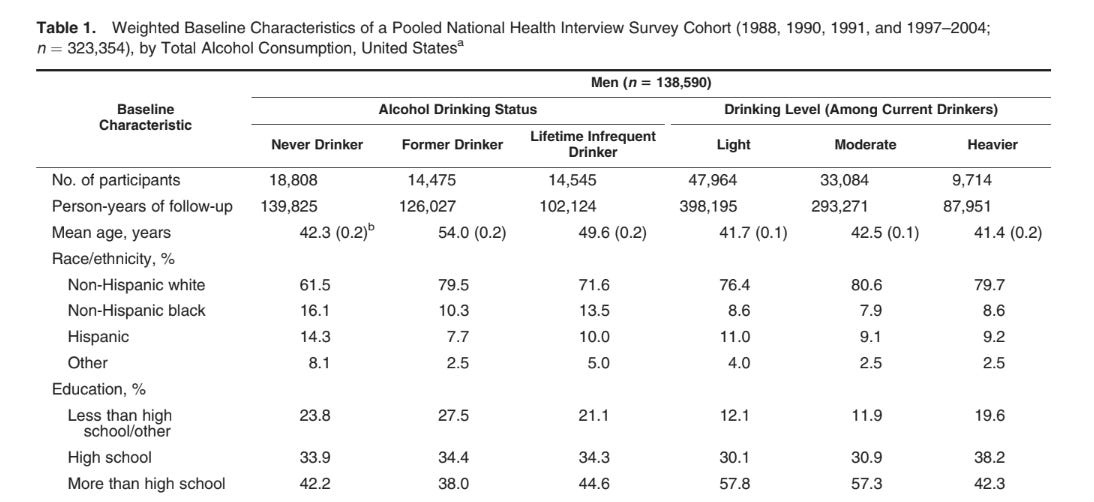 Former drinkers are 12 years older than never drinkers. People who went to college drink more and drank more. Look at the racial differences. It is a fucking mess of confounding. An economist running a natural experiment would shit their pants with data like this.