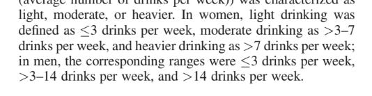 Presumably a cirrhotic patient or someone with a drinking problem would fall into Former drinkers category, but also someone who had a single fun year in college. And let us be clear, never drinkers are ONLY a SUBSET of people we would call non-drinkers. They had to be a particularly odd group in college. They drank fewer than 12 in all those years. And here is what light, moderate and heavier drinkers mean. Heavy drinking is a glass of wine a night in women, but also a fifth of vodka a night. A crazy meaningless bucket term.
