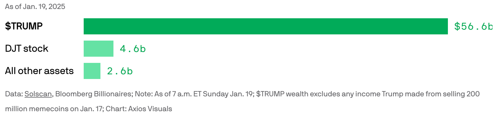The $TRUMP memecoin — a financial asset that didn’t exist on Friday afternoon — now accounts for about 89% of Donald Trump’s net worth.