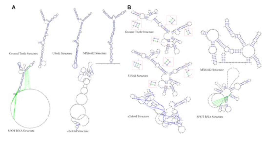 Visualization of two example UFold RNA secondary structure predictions. From top to bottom: ground truth, UFold prediction, and E2Efold prediction. Two RNA sequences are (A) Aspergillus fumigatus species, the RNA ID is GSP-41122, as recorded in SRPDB database. and (B) Alphaproteobacteria subfamily 16S rRNA sequence whose database ID is U13162, as recorded in RNAStralign database. Citation link here.