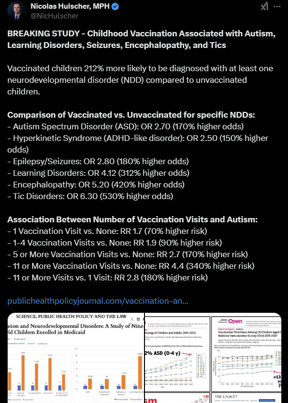 The only other critique I could find is from Xeno Rasusson who posted: “Just browsed it and once Mawson selects the absolutely worst methodology and measures to examine the association between vx and NDD.” I offered to give him the data so he could analyze it and he’ll let me know. The methodology was limited by the data source (since Medicare isn’t going to give Tony access, he went with what was available), and Xeno acknowledged that. He wasn’t able to explain why the autism diagnosis was associated with more vaccine visits and not more total visits.