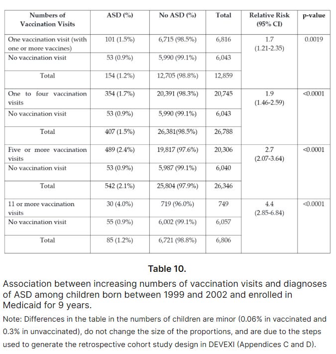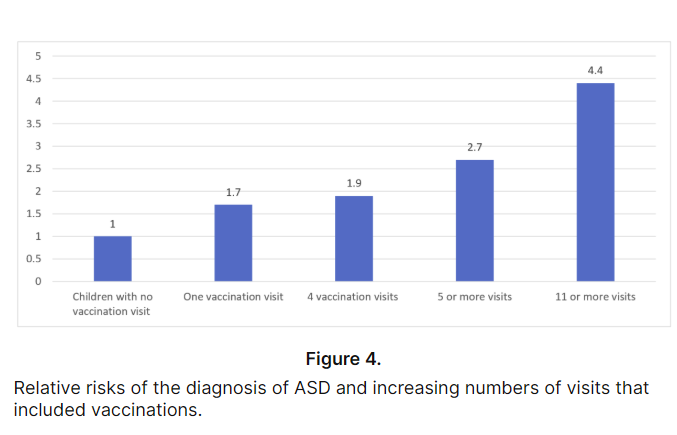 Relative Risk (RR) for autism for kids with just 11 vaccine visits was a stunning 4.4. Since most kids in America get the full CDC schedule, close to 80% of all autism cases in America are caused by vaccines