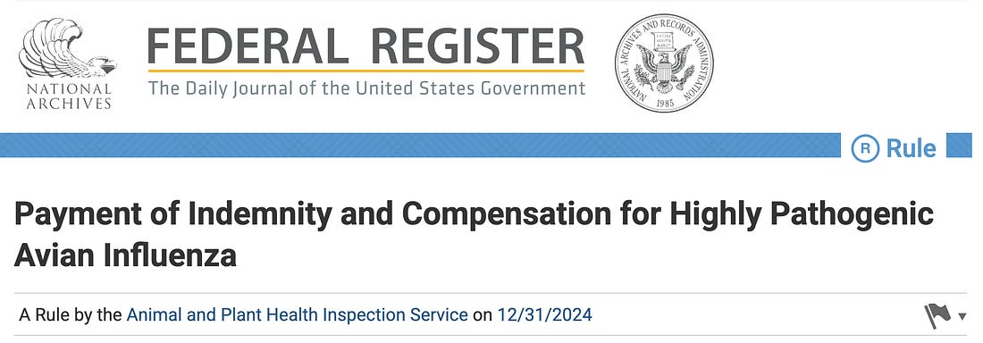 As of November 2024, the costs associated with the ongoing [H5N1] outbreak have exceeded $1.4 billion, including $1.25 billion in indemnity and compensation payments. Of this, APHIS has spent approximately $227 million on indemnity payments to premises that have been infected multiple times with HPAI.