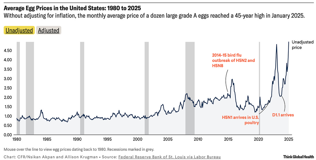 The monthly average price of a dozen large Grade A eggs hit a 45-year high in January 2025, making food less affordable for millions.
