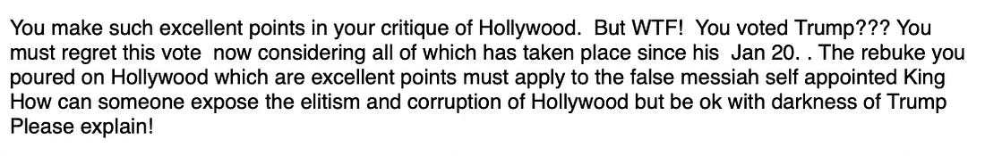 Indeed, I didn’t explain why I voted for Trump in the Tablet piece. It was already too long. No doubt many reading it thought, who cares what she thinks? She voted for Trump. I’m sure there was a time when I would have thought the same thing. I used to be a faithful, loyal Democrat. I used to be a cheerleader for Hollywood. I thought I would do anything for love. But I found out that there was one thing I couldn’t do.