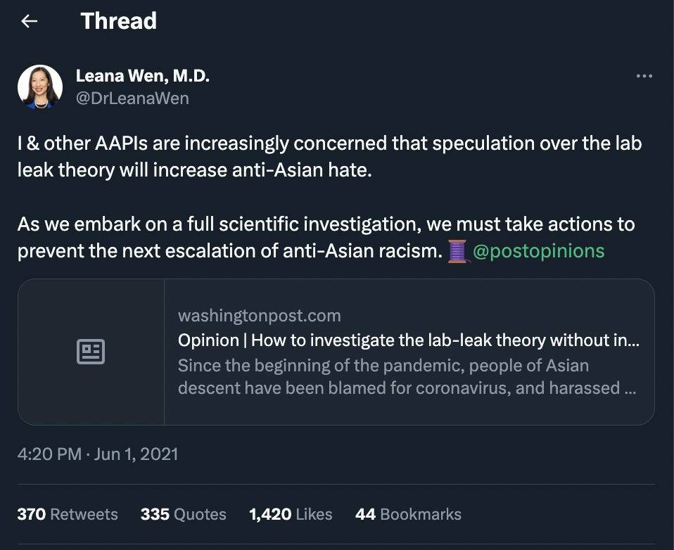 It should also surprise absolutely no one that Dr. Wen also downplayed the Wuhan lab leak theory out of concern that it might lead to “anti-Asian hate.”