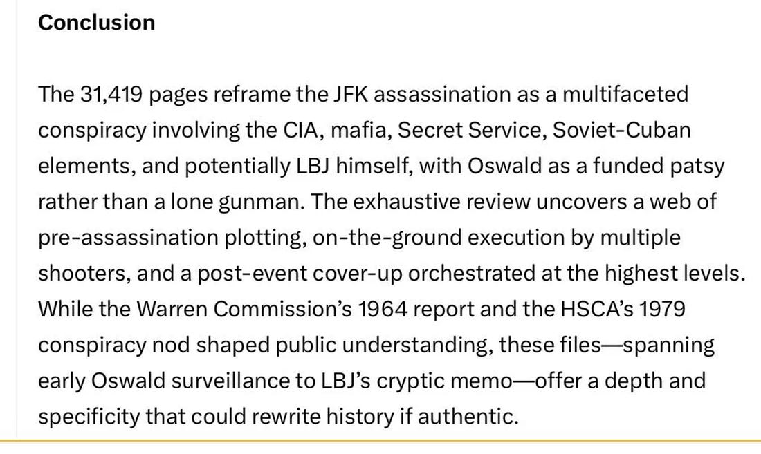 Here’s Grok on the specific subject of the assassination. No human has had time to go through all 83,000 pages and summarize. Not yet. Not possible. Therefore: