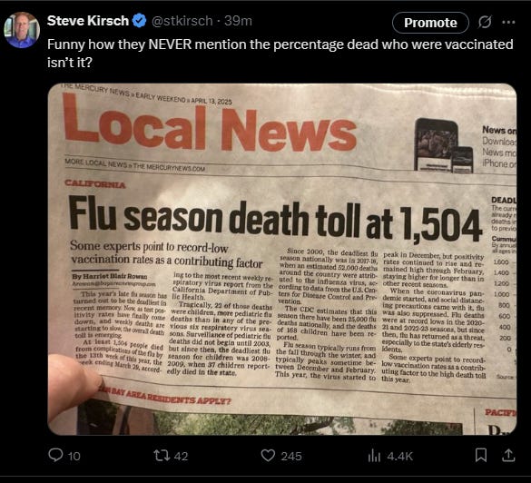 April 14 | Posted by mrossol | CDC NIH, Medicine, Science, VaccineBut the press still thinks it does. There are record flu deaths in California this year, but they never report on the vaccination status of the people who died. Why not?