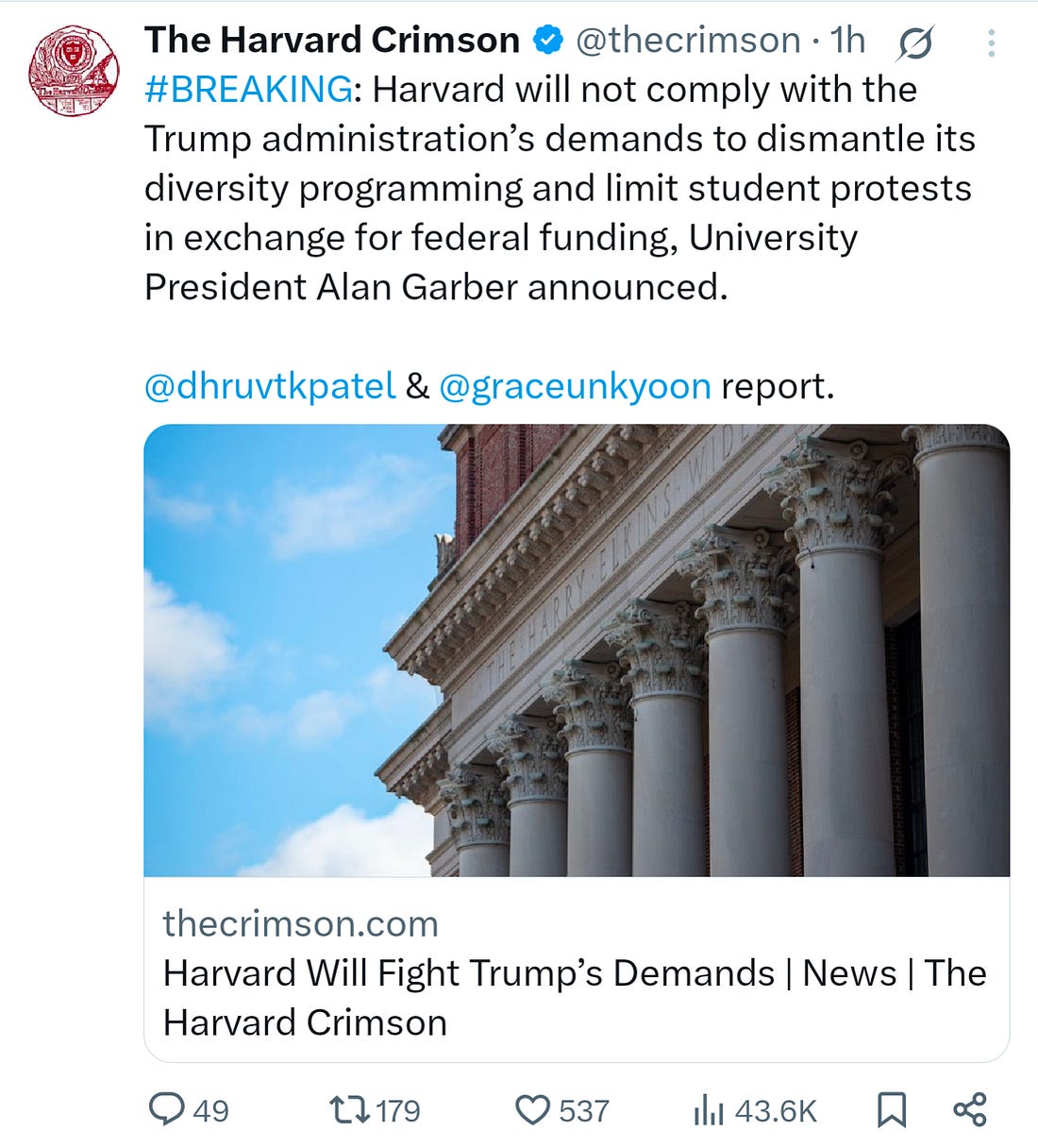 Alan Garber is smart & tactical. It’s important to understand that at the start. Today, Harvard University announces that it will not comply with the Trump administration’s demands to eliminate DEI and other moves to limit antisemitism on campus. As such, Harvard stands to lose billions of dollars in federal funding.