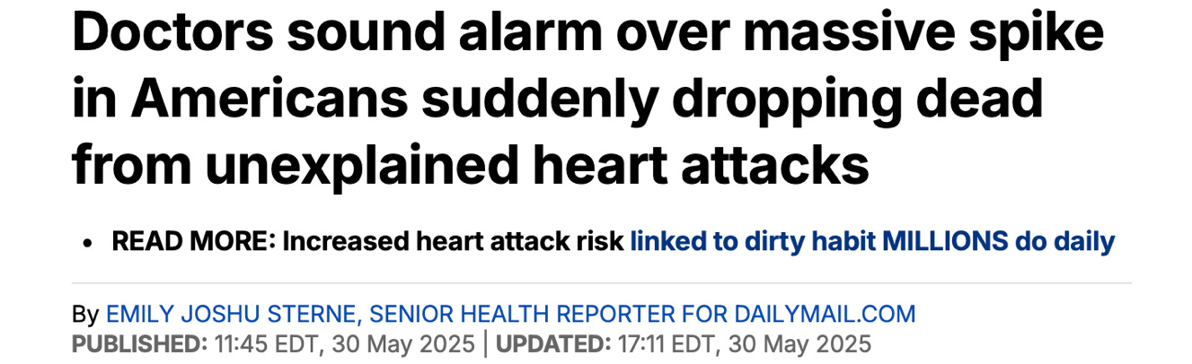 When a large number of people, particularly younger adults with no history of heart disease, begin dying alone and unexpectedly at home, it defies baseline expectations. This makes “at-home” deaths not just a red flag, but a canary in the clinical coal mine— a symptom of institutional denial, diagnostic blindness, and mass gaslighting.