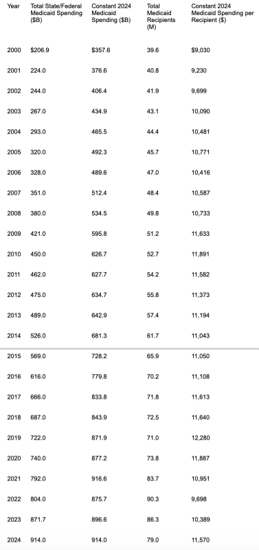 Of course, the Dem rhetoric is that deep cuts in Medicaid will be used to fund tax cuts for the rich. Never mind that sweeping Medicaid reforms are badly needed and fully justified given that the rolls have grown from 40 million to 80 million since the year 2000 alone—even as total Medicaid spending has more than quadrupled and real benefits per recipient have grown by nearly 30%.
