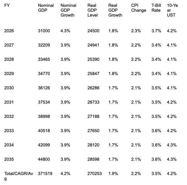 As shown below, the CBO baseline which projects $22 trillion of deficits over FY 2026-2035 assumes that nominal GDP will grow at a 4.20% compound rate, generating a total of $371.5 trillion of nominal GDP over the period. In turn, baseline revenue under current law of $67.167 trillion amounts to 18.1% of nominal GDP.