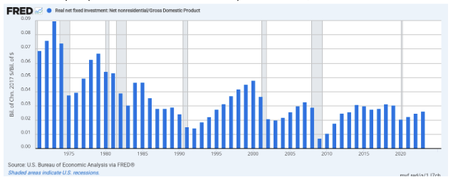 As is evident from the graph, investment levels relative to the size of the economy have actually continued to shrink, notwithstanding cutting the corporate tax rate from 35% to 21% and supplying an additional $75 billion per year of incentives for CapEx by unincorporated businesses via the 20% investment deduction.