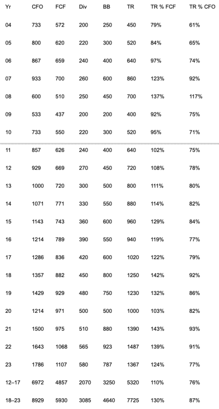 Indeed, with 87% of operating cash flows being devoted to dividends and stock buybacks during 2018-2023, there was only $1.161 trillion left for net investment on Main Street. That compared to the 76% shareholder return ratio during the six years before the Trump tax cut, which had left $1.673 trillion for net investment on Main Street.