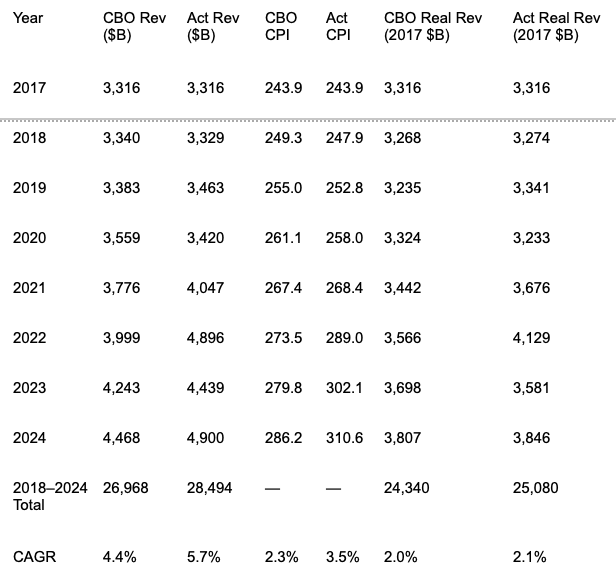 To wit, the CBO forecast at the time of the TCJA enactment assumed real growth of 2.0% per annum through 2024. In fact, the actual figure was 2.1% per year—or more than close enough for government work.