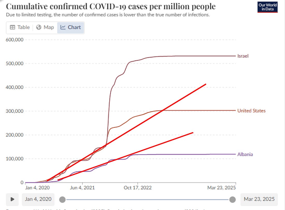 When you look at the key indicators, such as no “discontinuity” in the cumulative COVID mortality curves, it’s obvious that the shots didn’t reduce COVID, even though study after study claimed a miraculous benefit.