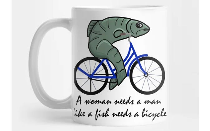 But beyond that empty promise lies an even bigger falsehood. The AWFLs were assured they would never need men anyway. A woman needs a man like a fish needs a bicycle. But now the bicycle’s gone missing, and the fish are writing op-eds wondering why the ocean feels so empty.