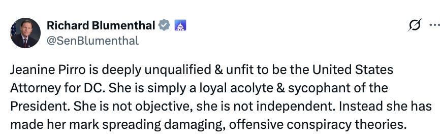 WSen. Blumenthal slandered US Attorney Pirro while on the Senate floor, just the week before attacking me. Anyone see a pattern here?