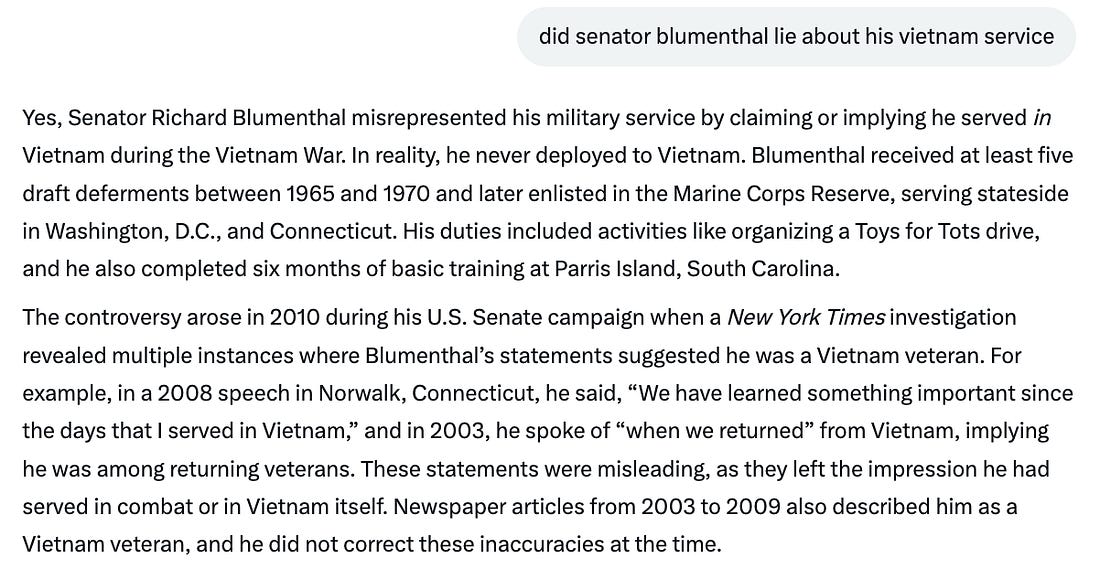 For reference, according to GROK and just about any news source out there- Senator Blumenthal lied many times throughout his career about serving in Vietnam. This is a true story: