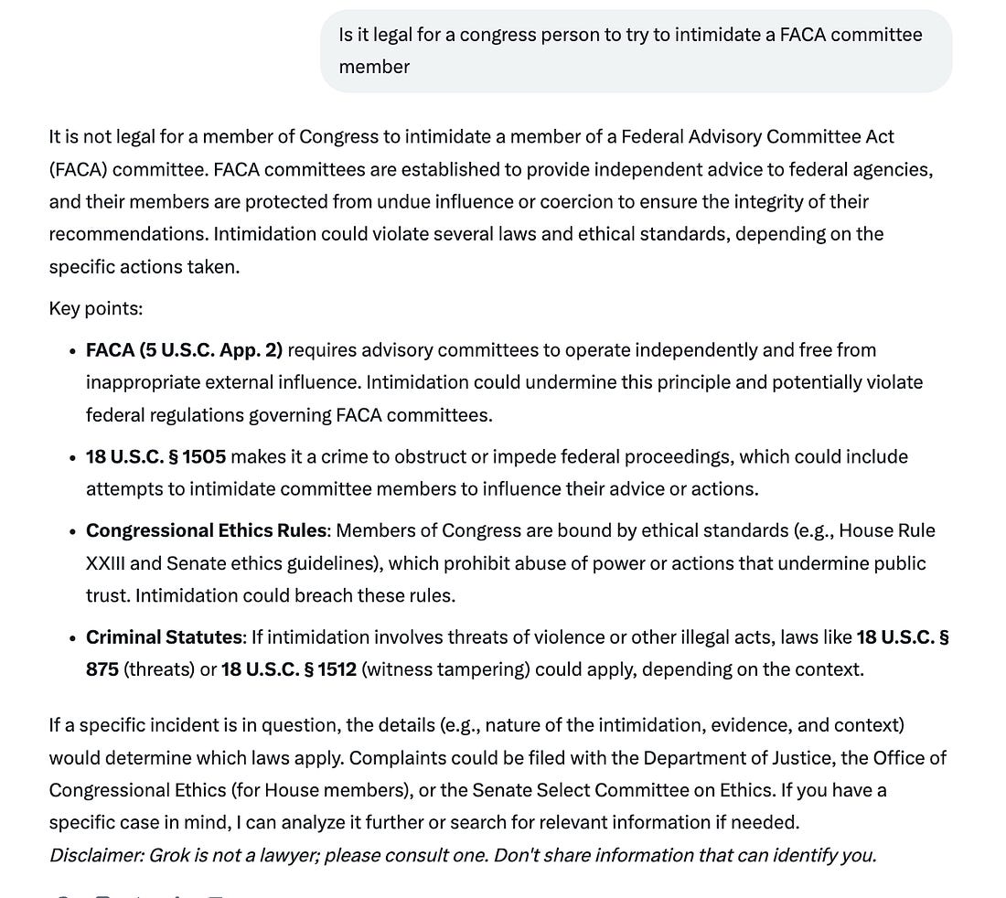 But don’t take my word for it. So rather than try to distill pages and pages of Federal regulations for you all, I asked GROK: “Is it legal for a congressperson to try to intimidate a FACA committee member?”