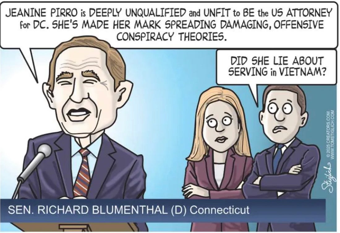 Now, earlier on Friday – before the shooting, I did post the memes for the Friday Funnies (about 20 in all, that morning) on Substack. As you all know, I collect memes, cartoons and funny video during the week – and put them out in one great big post. Some are controversial, some aren’t. It turns out there was one biting meme about Senator Blumenthal. The context of the meme was that Senator Blumenthal was accusing Janet Pirro of spreading damaging and offensive conspiracy theories, with the onlookers in the meme are asking whether “she lied” about serving in Vietnam.