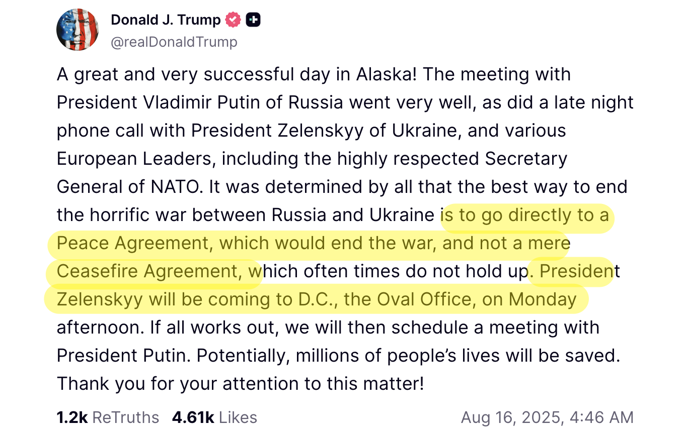 Not only did Trump completely dominate the media cycle —again— but he’s once again shifted the burden back to his political enemies. Having announced that he resolved “most” of the issues with President Putin, it’s now Zelensky’s chance to take the pathway to peace or bobble the ball.