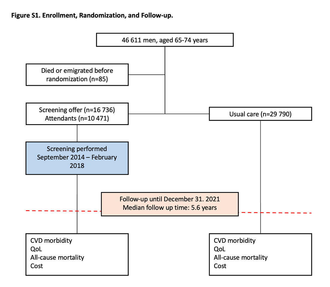 In DANCAVAS, screening was offered to ≈ 16,700 people and not offered to ≈ 30,000 who remained in the Danish healthcare system. Randomization was at the invitation letter level.