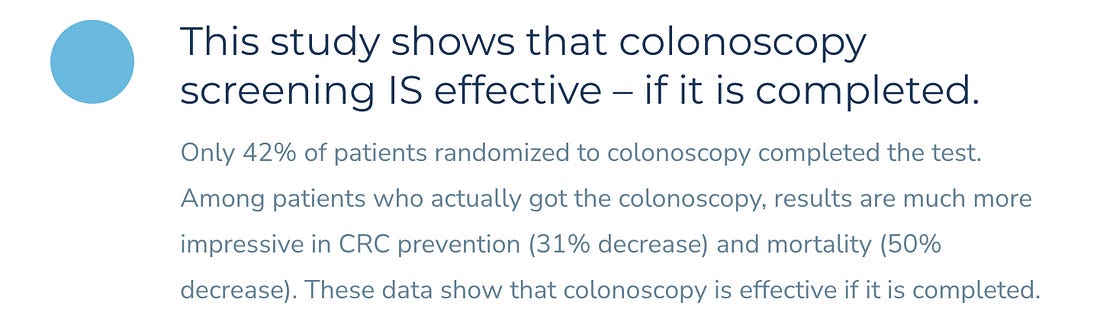 Similar to DANCAVAS, a large fraction of individuals (58%) assigned to the colonoscopy group did NOT have the procedure.