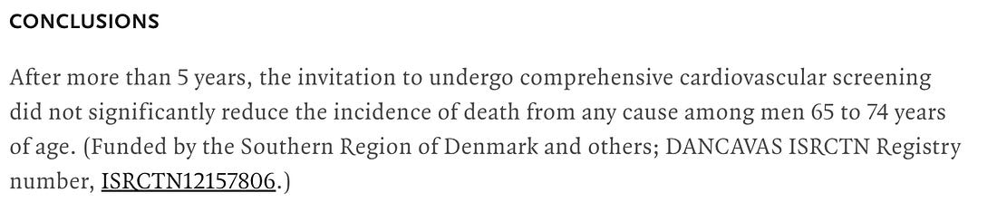 In the DANCAVAS trial, the intervention was an invitation to an efficient pragmatic cardiac screening program including blood, ECG and imaging tests. If that screening program identified an issue, action was recommended through the normal Danish health system. The control arm was people not invited to screening who received usual Danish healthcare. The trial endpoint was mortality. Alive or dead.