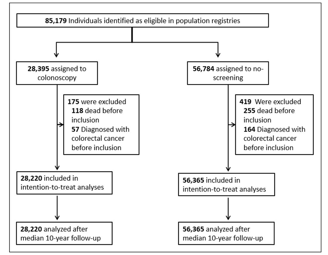 In the NordICC trial, ≈ 28,000 people were assigned to have colonoscopy and ≈ 56,000 were assigned to no screening.