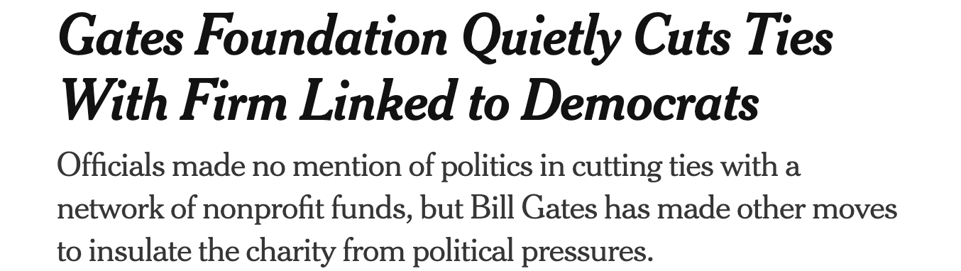 By way of explanation, the Gates Foundation excreted a buzzwordy statement insisting that its move to cut ties with Arabella was only “a business decision that reflects our regular strategic assessments of partnerships and operating models.” Nothing to see here.