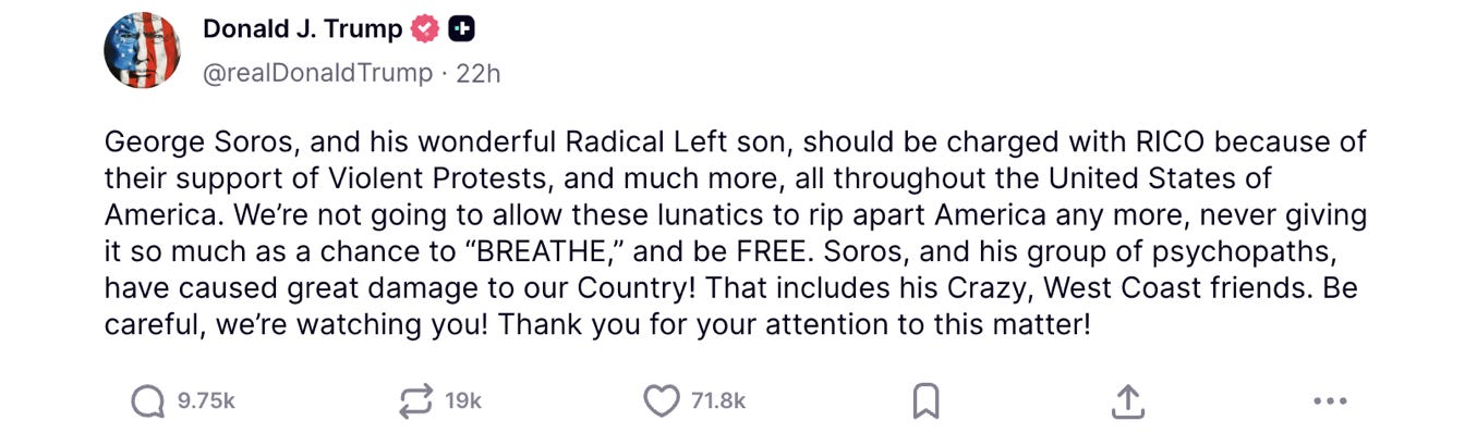 Let’s connect some dots! First, yesterday President Trump randomly and quite colorfully posted about how the Soros family should be investigated for mob-like racketeering: