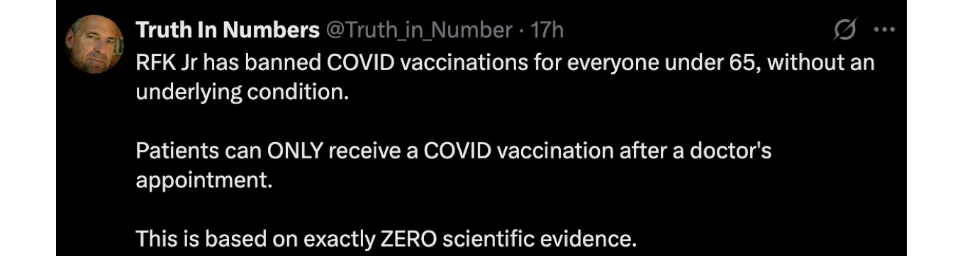 💉 Kennedy wasted no time. The Infectious Disease Special Edition ran the story headlined, “FDA Rescinds EUA but Approves Updated 2025-2026 COVID Vaccines.” With Monarez out, Kennedy announced on X that he’d ended the still-onoing “Emergency Use Authorization” for the covid vaccines, which changes everything.