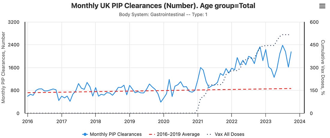 Note: the more severe a reaction is to a pharmaceutical, the rarer it is, and as such, the COVID vaccines disabled far more than they killed. While investigating the economic cost of the COVID vaccines, Ed Dowd’s team made the horrific discovery that the vaccines caused a massive spike in disability in America (16% more Americans are now disabled than they were at the start of COVID)—and this increase shows no signs of stopping (it’s actually beginning to accelerate). The above chart came from their investigation of England’s disability data (and virtually mirrors England’s increase in disability for immunological diseases).