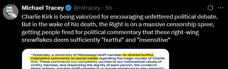Apparently, in some attempted “gotcha” effort, social media influencers on the Left are calling out MAGA’s purported ideological pivot following the vile response by many on their side to the assassination of Charlie Kirk last week. Kirk’s legion of admirers is publicly identifying individuals—many of whom unsurprisingly work in the education system—cheering Kirk’s murder online. Several have been fired including perpetual head case Matthew Dowd at MSNBC.
