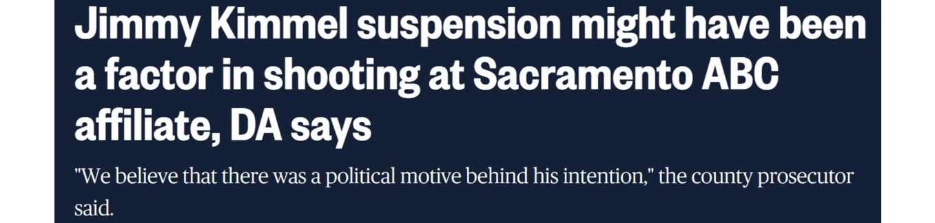 It wasn’t only Sacramento. Yesterday, the New York Post ran a heavily ironic story headlined, “Charlie Kirk tribute scrapped by Sinclair after local TV giant got threats against its ABC stations.” The Post reported that, “In addition to scrapping the Charlie Kirk tribute, Sinclair placed additional security measures at all of its facilities.”