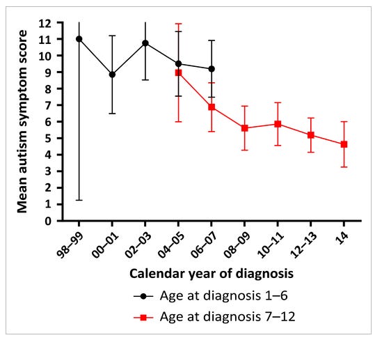 What has happened is that there has been a rise in awareness of the disease and an enormous broadening of the diagnostic criteria. There are lots of great papers on the topic. My brief, and hopefully acceptable, take is that from 1994-2013, Asperger’s Syndrome was included in the DSM. Some children who received this diagnosis were truly disabled, others (and I say this lovingly and with no ill intent) were just quirky. In 2013, Asperger’s disappeared, rolled into autism. This evolution swelled the roles of those diagnosed with autism. There has been some outstanding research demonstrating that as the number of people with autism increased, the number of symptoms displayed by people with autism decreased. Here is a figure showing this from an article by Olof Arvidsson, Christopher Gillberg, Paul Lichtenstein, and Sebastian Lundström: