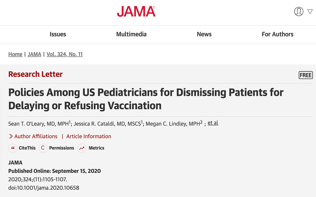 This is a great example of physicians upholding the rights of the collective over their individual patients. They would rather do harm than treat an unvaccinated child. and ut us reasonable to speculate the the numbers may be considerably higher now. A more recent article in the New England Journal of Medicine reports that over 50% of pediatricians endorse and practice in this way.