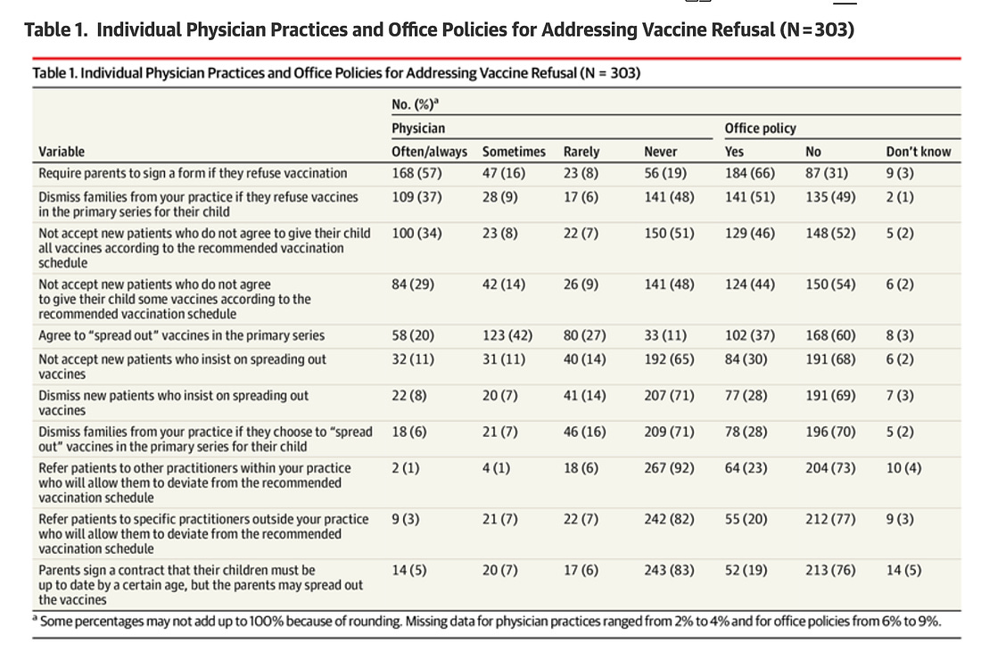 …51% of pediatricians reported that their office had a policy to dismiss families if they refused vaccines in the primary series, while 37% of physicians reported often/always doing this themselves. Physicians more frequently dismissed families for refusing (37%) than for spreading out (6%) vaccines in the primary series, and a similar pattern was seen for office policies (51% for refusal vs 28% for spreading out).