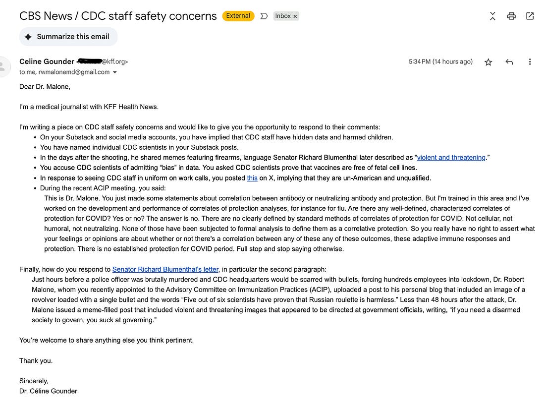 I find it ironic that after the CDC, through the Foundation for the CDC, paid “SHOTS Heard” – a CDC Foundation funding operation, to cyberstalk and gangstalk me and many other physicians, and was likely involved in the attempts to get my license revoked for being a “mass murderer” by speaking out regarding my concerns relating to the ethics, pharmacology, and pathologies associated with administering the COVID gene therapy-based products (both recombinant adenoviral and non-viral mRNA-delivered). This resulted in many, many threatening letters, deplatforming, and targeted harassment for years on end. Yes, even a death threat or two. Now, CBS and KFF are asserting that I should respond to “ CDC staff safety concerns… and to “respond to their comments.” A case can be made that “SHOTS Heard” threatens weapons violence in the very name of the CDC-funded second-tier contractor (second-tier to the “Public Goods Projects”, which was the prime CDC Foundation contractor.)