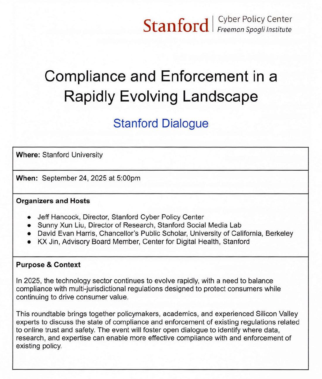 On September 24, the Cyber Policy Center hosted a secret dinner between its leaders and top censorship officials from Europe, UK, Brazil, California and Australia. The meeting was titled “Compliance and Enforcement in a Rapidly Evolving Landscape.” Frank McCourt, the same person behind the Stanford Internet Observatory, financed the gathering through his “Project Liberty Institute,” (PLI), toward which he gave $500 million to “strengthen democracy” and “foster responsible technology.”