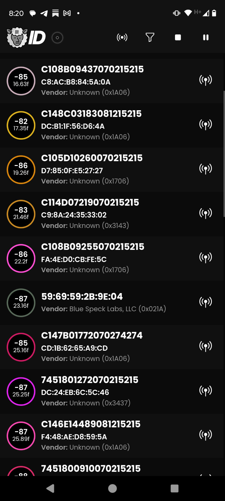 A screenshot from Brutus’ phone showing the BLE scanner app. The highlighted devices are part of the surveillance network. The color-coding, indicates the location of the devices: yellow for his town, green for a neighboring town, and purple for ID status.