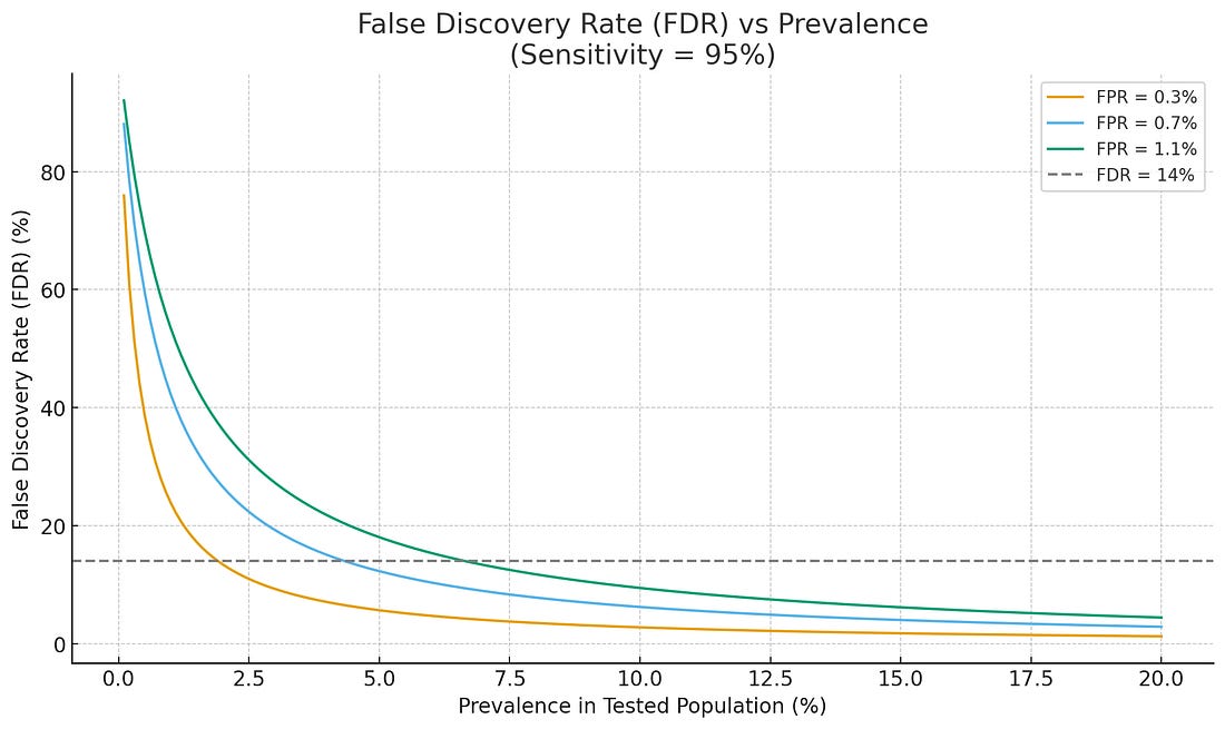 Result: Even “0.1% FP” in controlled conditions can produce a majority of real-world positives being false when prevalence is low.