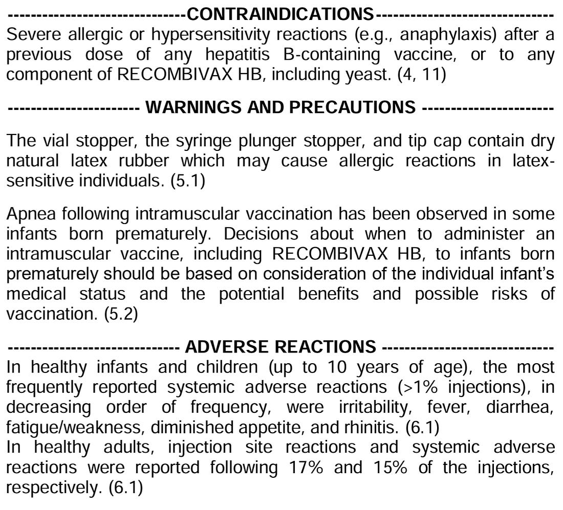 “Parents and health care providers should consider vaccine benefits, vaccine risks, and infection risks.” This sentence defines what health care providers need to document that they have discussed with parents. All three. That means for the children born of a Hepatitis B uninfected mother, parents need to be told that the risk of HepB to the newborn is close to zero. But it also means that, for parents living in communities where HepB is common, there needs to be a discussion that the risk of “horizontal transmission” is higher, and they should consider vaccinating their child for HepB. It also means that health care providers will have to explicitly discuss the risks and adverse events listed in the vaccine’s package insert. For example: