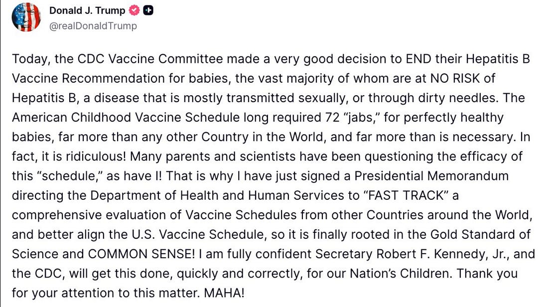 The ACIP not only voted to end the recommendation to vaccinate at birth in the case of low-risk pregnancies, but it also voted to enable parents/guardians to decide when or even if their children should receive this product. Another key point that the self-anointed arbiters of public health policy in corporate media seem to have overlooked.